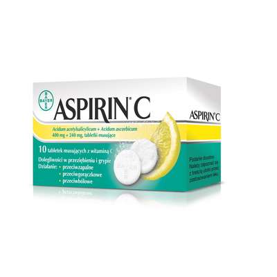 Działanie: Aspiryna działa głównie poprzez hamowanie uwalniania i biosyntezy prostaglandyn nienasyconych kwasów tłuszczowych; zmniejsza agregację płytek krwi poprzez blokowanie uwalniania z płytek krwi kwasu adenozynodifosforowego i tromboksanu A2. Działa przeciwbólowo, przeciwgorączkowo i przeciwzapalnie. Wchłaniane szybko i prawie całkowicie z przewodu pokarmowego – głównie w żołądku, w mniejszym stopniu z jelit. Szybkość wchłaniania zależy od pH zawartości. Jest powiązany z albuminą osocza w 50-90%. Łatwo przenika do tkanek, łożyska i mleka matki. Jest metabolizowany w wątrobie (mitochondria i retikulum endoplazmatyczne) oraz w innych tkankach. Jest wydalany z moczem głównie w postaci metabolitów (75% w postaci kwasu salicylurowego), a 10% w postaci niezmienionej. T 0,5 wynosi 2-4 godziny. Dodatek kwasu askorbinowego uzupełnia niedobory witamin powstałe np. W przebiegu przeziębienia.