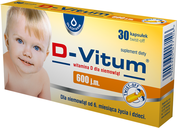 D-Vitum 600 j.m. – suplement diety zawierający witaminę D rozpuszczoną w oleju słonecznikowym. Produkt przeznaczony dla dzieci od 6 miesiąca życia.
