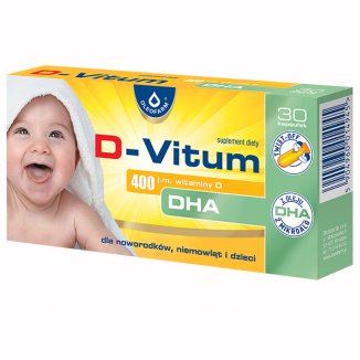 D-Vitum 400 j.m. DHA – suplement diety zawierający w składzie witaminę D oraz kwas dokozaheksaenowy (DHA). Produkt przeznaczony dla noworodków, niemowląt i dzieci.